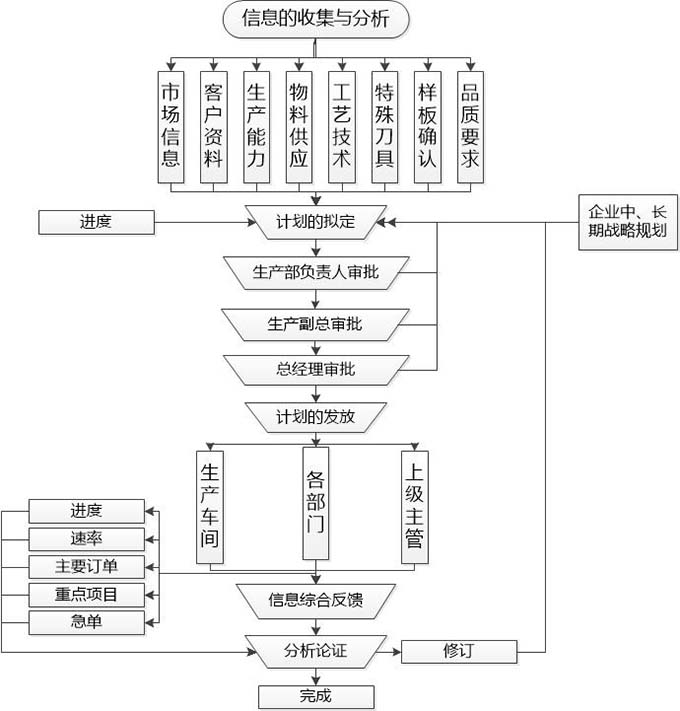 完善的生产计划的制定,信息是必不可少的,这些信息包括:市场信息;客户资料;生产能力,物料供应;工艺技术;特殊刀具;样板确认;品质要求等等信息